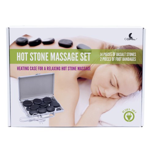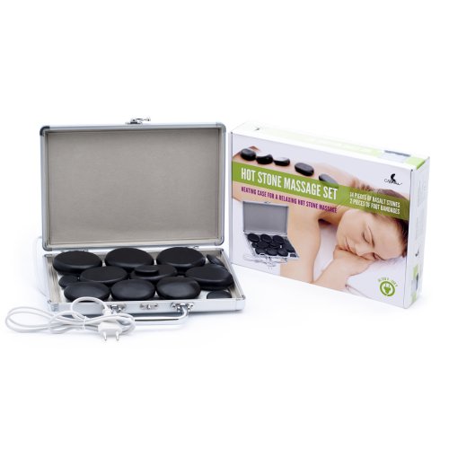 Sada obsahuje 14 kusů masážních lávových kamenů různého tvaru a velikostí pro dokonalou masáž celého těla. Kameny jsou uložené v hliníkovém kufříku, který jednoduše připojíte do el. sítě a necháte kameny nahřát na teplotu, která je vám příjemná (max. 70°C). Součástí balení jsou 2ks bandáží na chodidla pro praktické zafixování masážní kamenů.