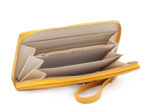 Velice elegantní dámská peněženka z vysoce kvalitní eko kůže se hodí pro každou moderní ženu. Zdobí ji drobná zlatá korunka a je vybavena odepínacím řemínkem na zápěstí. Prostorná peněženka, kde najdou své místo kromě peněz i veškeré doklady, kreditní i zákaznické karty. Peněženka má po obvodu zip a lze ji použít jako elegantní psaníčko do společnosti i na party.