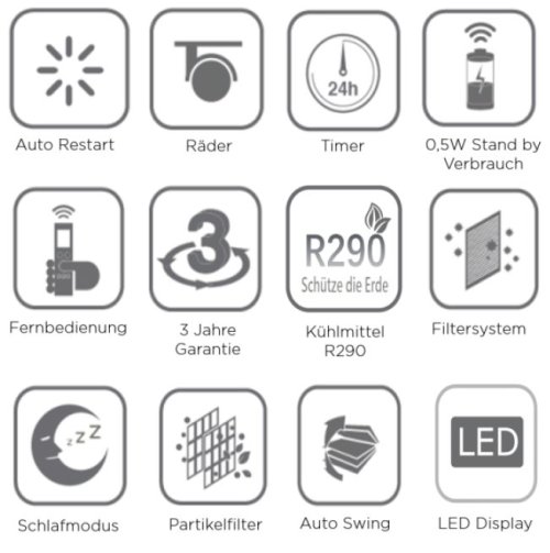 Mobilní jednotka je vybavena dálkovým ovládáním, umožňujícím pohodlné nastavení teploty, ovládání otáček ventilátoru nebo nastavení časového programování. Klimatizace v energetické třídě A používá šetrné chladivo R290.