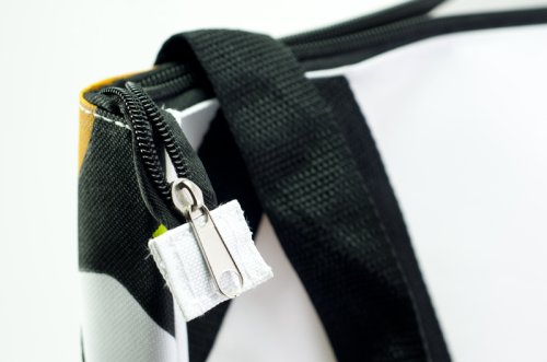 Taška je z odolné umělé tkaniny s černými ornamenty a černými uchy. Je opatřena zipem. Tašku lze prát šetrně v ruce. Doporučená nosnost je 2 kg.